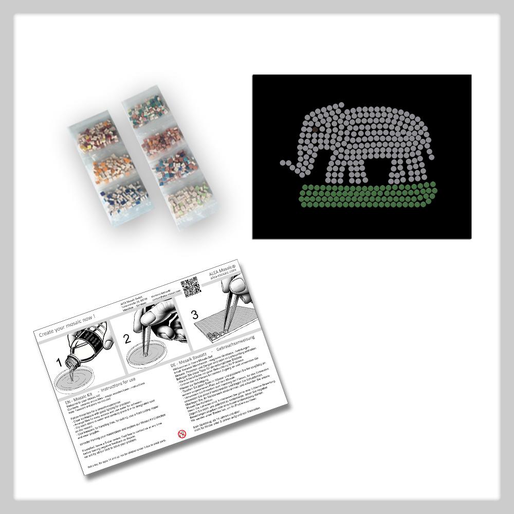 CONTENTS: Over 100 mini ceramic mosaic tiles - 20x15 cm wooden base with 1:1 printed pattern - step-by-step instructions