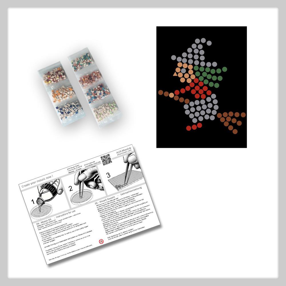 CONTENTS: Over 100 mini ceramic mosaic tiles - 20x15 cm wooden base with 1:1 printed pattern - step-by-step instructions